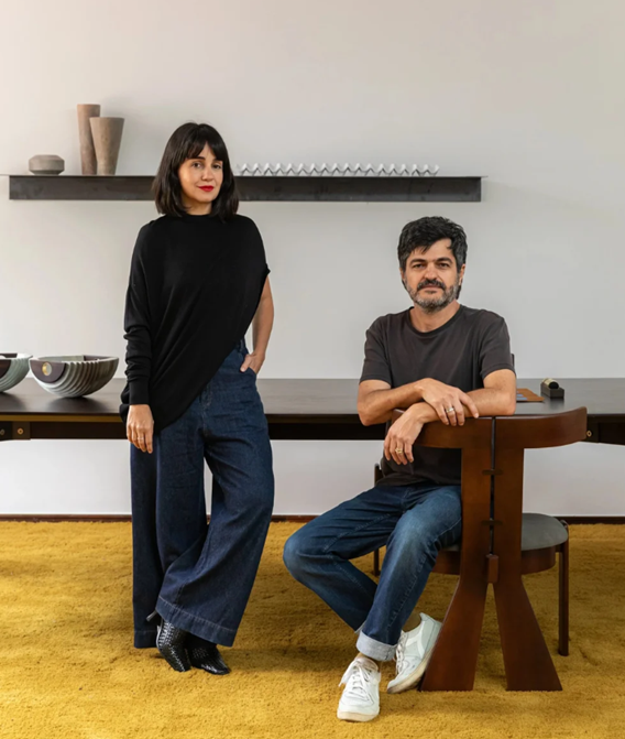 Vindos do interior de Minas Gerais, cresceram observando o avô João transformar madeira em utensílios com as próprias mãos. Essa experiência sensível com a matéria e com a criação autoral moldou, desde cedo, um olhar curioso e experimental sobre os objetos à volta. Mais tarde, vieram as formações acadêmicas — Marcelo em Arquitetura pela UFMG, com passagens por escritórios como o de Isay Weinfeld; Susana em Artes Plásticas pela mesma universidade, além de uma trajetória consolidada na moda à frente da direção criativa da Coven por quase uma década.