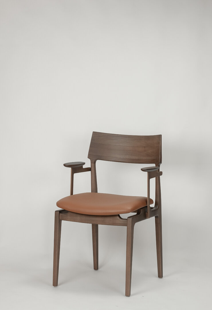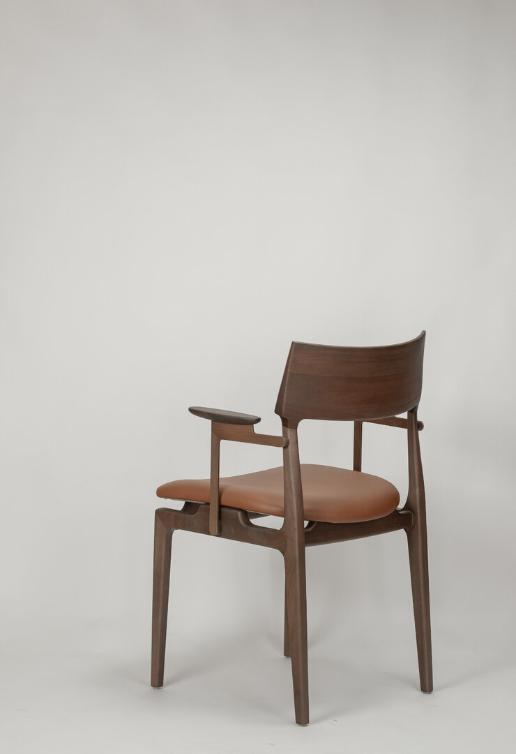 Disponível na versão com e sem braço. Estrutura em madeira maciça. Opções de encosto e encosto em madeira maciça ou estofado.